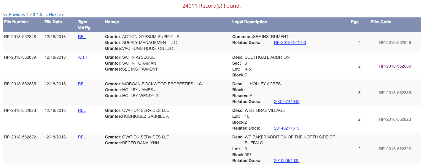When running a date range search, your results will be displayed in a list format. You’ll be able to see the File Number, File Date, Document Type, Grantor and Grantee Names, Legal Description, Number of Pages, and the Film Code of each record in your results.