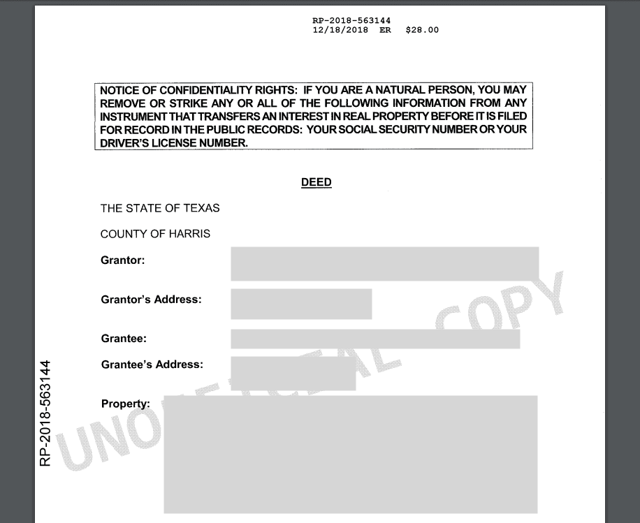 If the Film Code is highlighted in blue, you should be able to click on it to open a PDF image of the actual document. There, you can find various details on the property transaction and the parties involved, including the name of the new property owner or the name of their property-owning LLC. You may also find their mailing address.