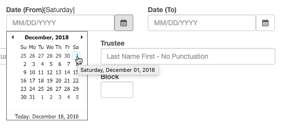 Whether paired with other filters or not, you can search for real property documents by the date when they were filed. You can search all the way back to January 1, 1961, however PDF images are only available for documents filed after March 23, 2000. To search by date, you need to specify a range. You can either click the calendar selection box and choose specific “to“ and “from“ dates, or you can directly enter each date in a MM/DD/YYYY format.