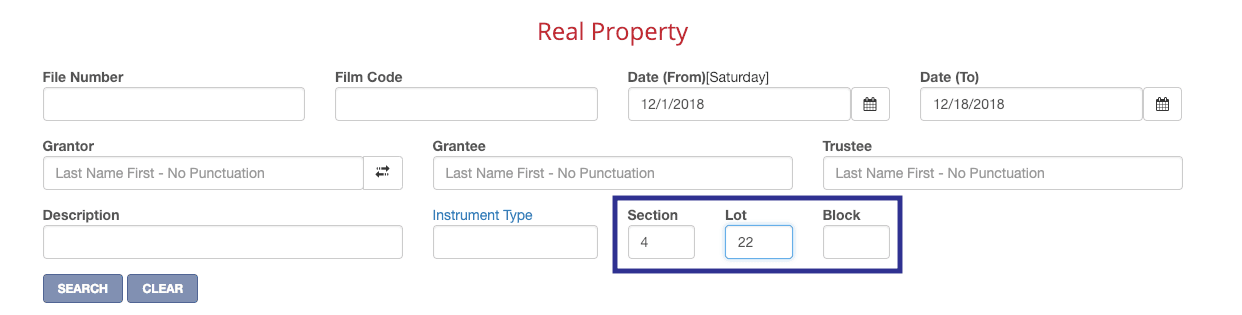 To search by Section, Lot, or Block, simply enter the number into the corresponding search bar. You can pair these filters with a Legal Description, Date range, or Grantor/Grantee name to make your search more granular.