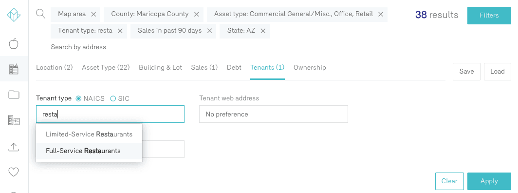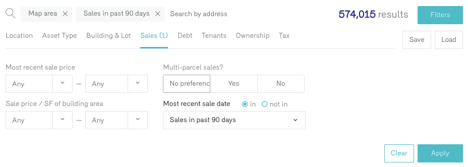 By adding sales and debt history filters, you can identify mixed use properties that are more likely to sell. Under the Sales tab, you’ll find filters for “most recent sale date” and “most recent sale price.”