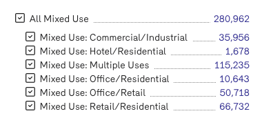 Next, you can filter your search only for properties of a specific classification. In the Asset Type tab of Reonomy’s web app, you can select filters for a number of different mixed use sub-classes, or simply search for “All Mixed Use” properties.