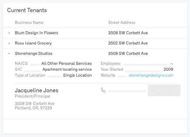 Here you will be able to see the reported owning entity, which could be an individual, investment group, or an LLC. Furthermore, you’ll be able to see the contact information of the individual people associated with the property ownership, included those that are members of an owning LLC. If you move over to the Tenant tab, you’ll see a list of all current property tenants, along with the contact information of decision-makers.