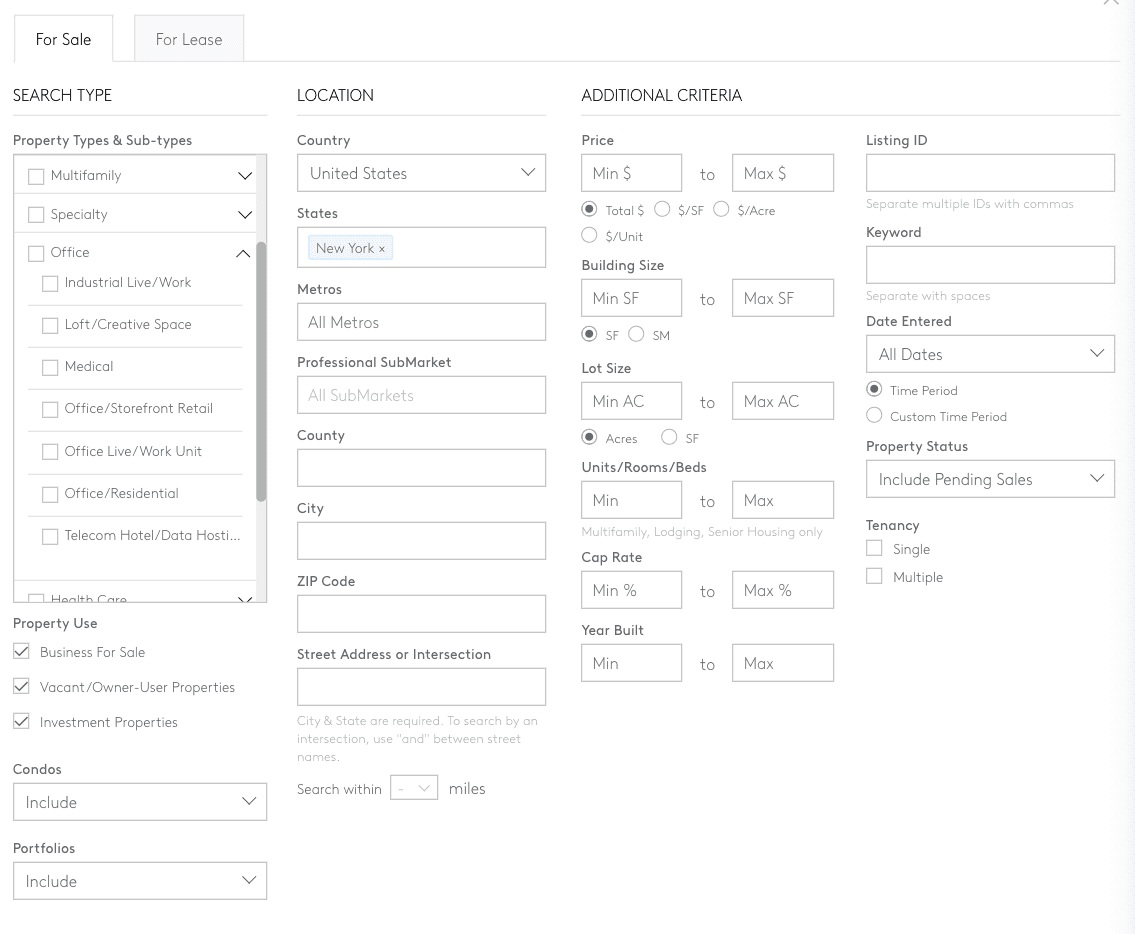 LoopNet does not have a stand-alone filter for “mixed use,” however the Advanced Search menu allows you to search for a number of specific types of mixed use properties throughout the United States. For example, you can search for property sub-types such as: