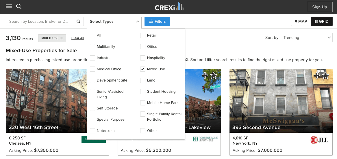 Another popular commercial listings platform, CREXi actually features a mixed use property filter in its main search options. If you select “Mixed Use” as the property type you are looking for, you will see mixed use assets of any kind in your results.