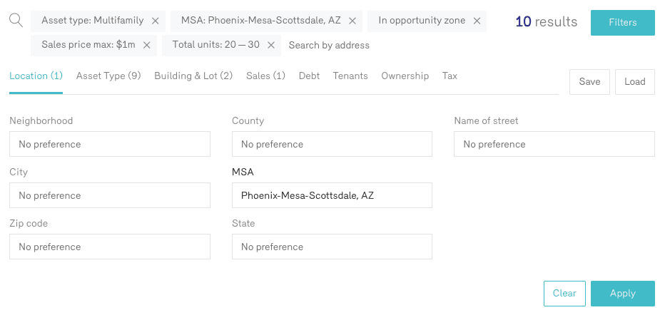 After entering your location, you’ll be brought to a more extensive search page where you can filter by multifamily properties, or a number of other property types and measurements.