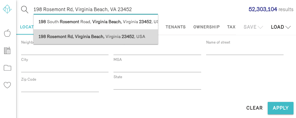 The first and most straightforward way to find a property is to search using its address (if that is a known quantity). In the platform, simply enter the address of your desired asset in the top search bar, then click the correct address in the dropdown:
