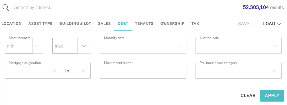 Search for target properties that meet your debt criteria. Perform debt-based property lookups with the following debt filters: