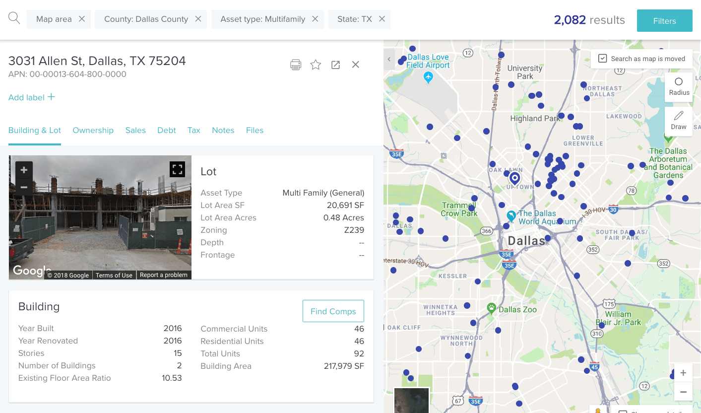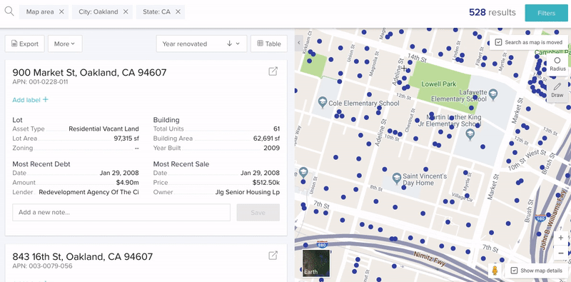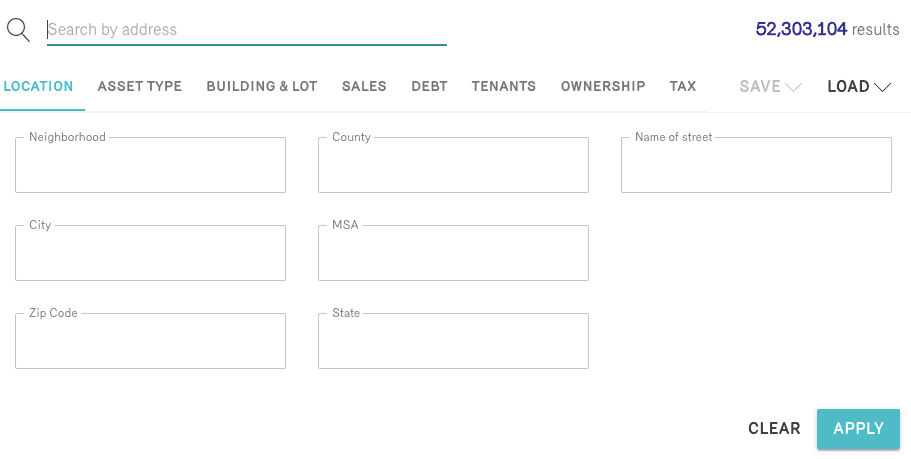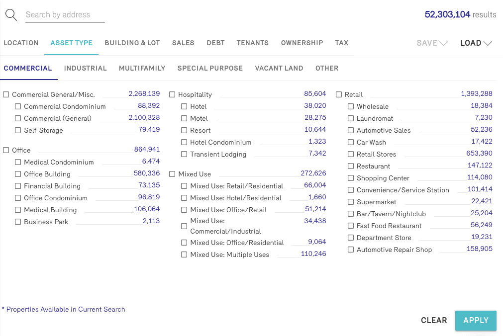 Let’s say you don’t know the address of a building, but know where it is. Or, let’s say you want to field a list of property owners from scratch to use as a lead list for outreach and marketing. You can search your desired market for properties, on a variety of different levels, with filters including:
