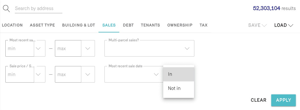 Or, you can search for properties that meet your search criteria for sales date and sales amount. Optimize searches by adjusting the range of these categories. Property sales history searches aide in identifying properties with the potential to sell soon, as well as identifying property owners that have purchased or sold within a particular period—say, recent buyers and sellers.