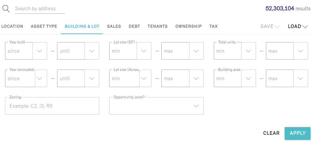 You can also refine your commercial property search by searching for properties that meet certain characteristics. The Building & Lot tab contains seven different search options, including: