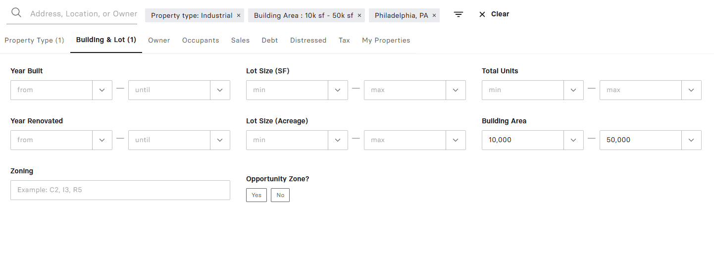 If you’re searching for an apartment building owner, for example, after adding an asset type filter, you can use Building & Lot to narrow down results. You can search based on number of units, building area, lot square footage, building age, renovations, and so on.