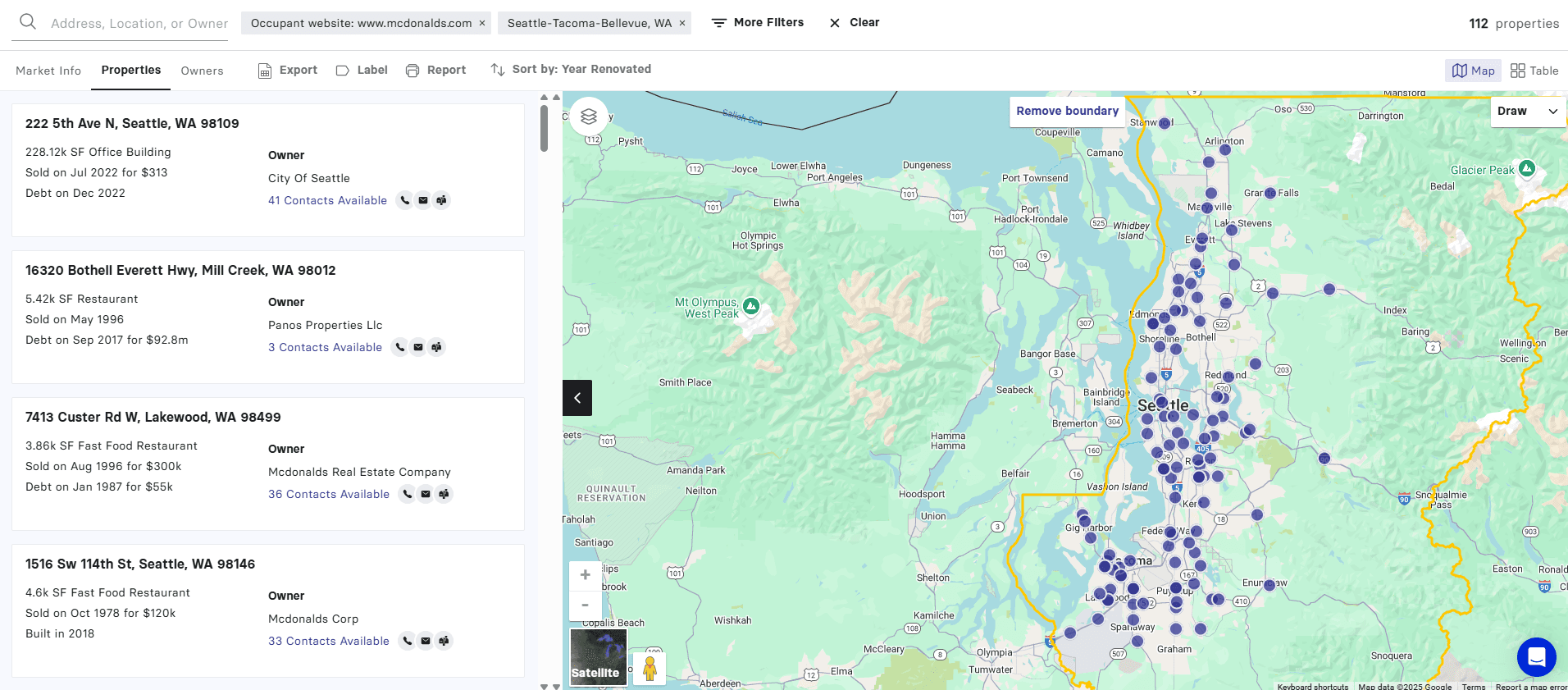 For some flexibility here, the Reonomy platform offers the ability to search only for owners and properties that are owner-occupied. In any event, these owners would all be a good starting point for the developer looking to bring a McDonald’s to their pad site.