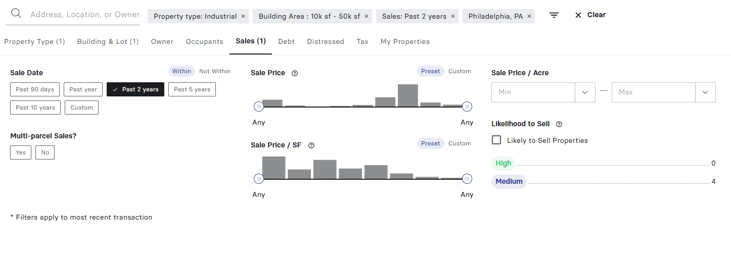 For potential off-market buyers, sales history can make or break the value of a commercial property. On Reonomy, you can use search filters to find property owners of buildings sold within a certain time or price range. You can also search specifically for the most recent sale date and price.