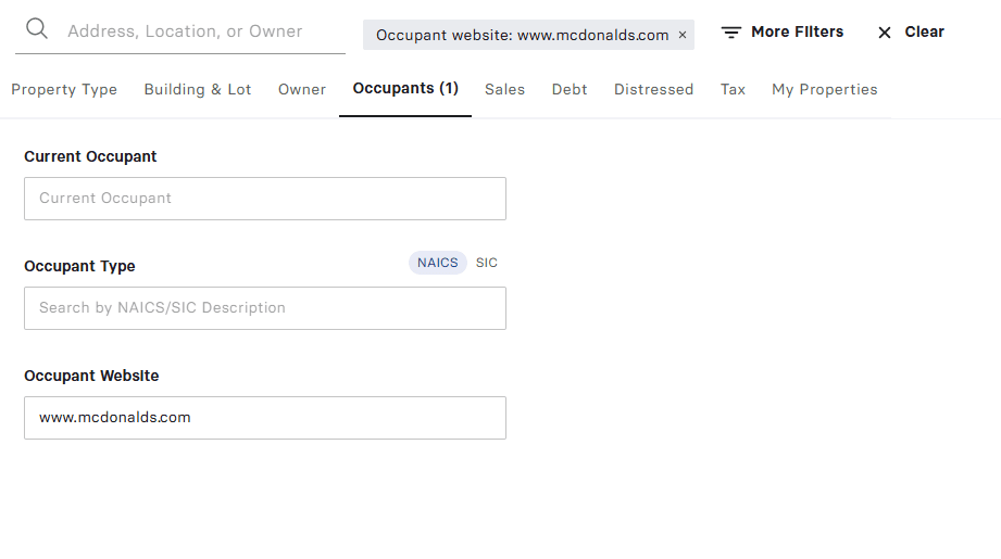 Another way this developer might use Reonomy is to target a very specific franchise that they think will complement the mixed-use development they have planned. In this case, let’s say he wants to put a McDonald’s on one of the pad sites, but needs to find another person to develop the site and arrange the deal with a franchisee directly. In order to do that, the developer uses Reonomy to search by tenant.
