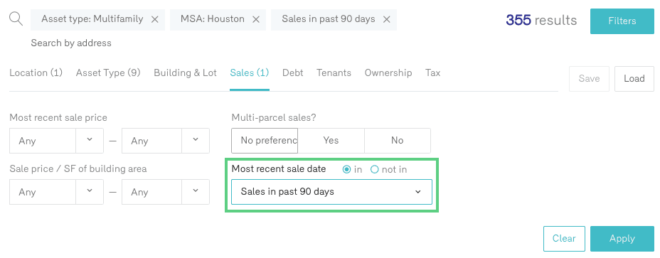 If you’re a sales broker, finding prospects actively looking to sell is an ongoing battle, especially when searching off-market. In the Reonomy Platform, there are several prospecting searches to find leads that are likely to list in the near future—including filters for property sales history. These should be applied in combination with the property type and geographic searches mentioned above. One option is searching for properties that have not sold in the last 10 years. The average holding period of a commercial property is 10 years. If a property hasn’t sold in that period, it’s more likely to sell than one that has.