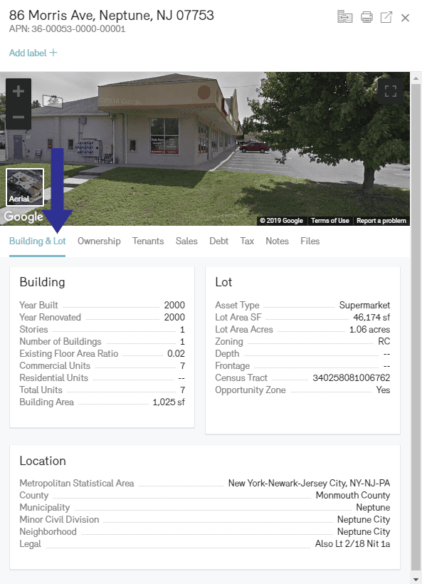 Upon either clicking one of the dropdown selections or pressing “enter” on your keyboard, you’ll be taken to the profile page of the parcel that sits at the address you’ve entered. Here, you can find building and lot information like the size of the building and lot, the age of the building, its metropolitan statistical area (MSA), whether it sits in an Opportunity Zone, and much more. You’ll also be able to see the property’s owner records, sales records, mortgage records, as well as tax valuations and who the current tenants are, all of which we cover in more detail below: