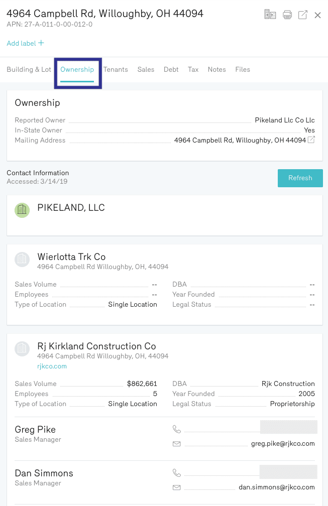 With property sales records, you can see the LLCs historically involved with transacting an asset. Property owner records, however, show you more in-depth details associated with current owner. First and foremost, Reonomy owner records show you the current recorded owner of a property, LLC or individual, along with the contact information of the individuals associated with ownership in any way (including those behind an owning-LLC).