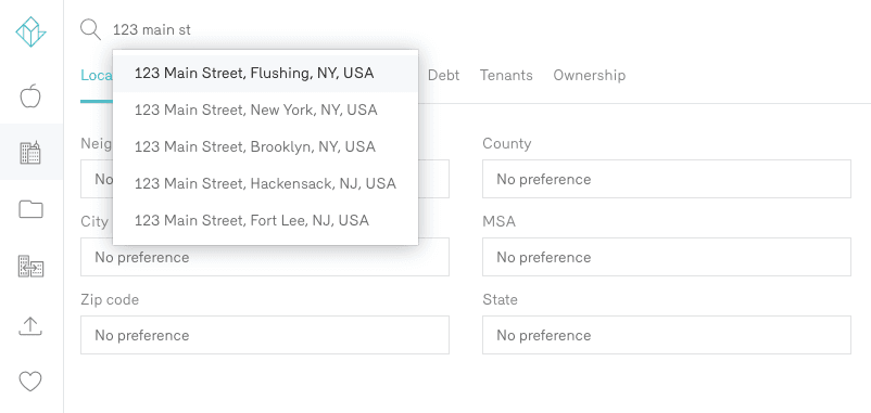You can type a property address directly into the search bar at the top of the page. And unlike many public records search portals, Reonomy allows for some leeway in how an address is entered. For example, you could enter, “9th Ave,” “Ninth Ave,” or “Ninth Avenue,” into the search bar (of course followed by a city and state), and you’ll be taken to the same property, regardless of the actual recorded address of the property. In fact, by the time you’ve entered a few letters, the dropdown box in the search will have already populated addresses that match what you’ve typed.