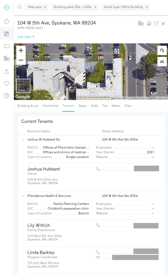 On top of the people that own the property, Reonomy also lets you see the people who are currently tenants in the building. When looking at the profile of any commercial property (retail, industrial, office, etc.), you can see all of the current tenants in the building by the name of their business. You can also see the name(s) of tenant contacts, along with their phone number and relative position.