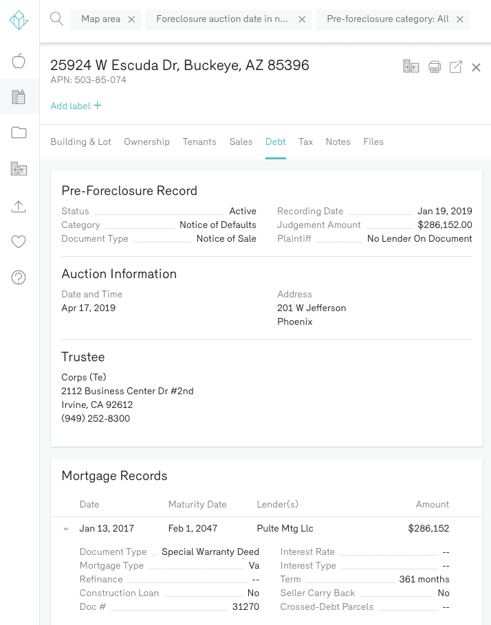 Another unique part of Reonomy’s debt records is the ability to see if a property is currently in pre-foreclosure. This includes what category of pre-foreclosure the property is in, its current status, the recording date, judgment amount, and more.