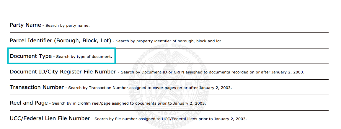 ACRIS is the Automated City Register Information System for Manhattan, Queens, Brooklyn, and the Bronx, with property records dating back to 1966. It serves as perhaps the most prominent, reliable example of a government-run site of public property records. In order to find recently sold commercial properties on ACRIS, you can start by choosing to search by document type.