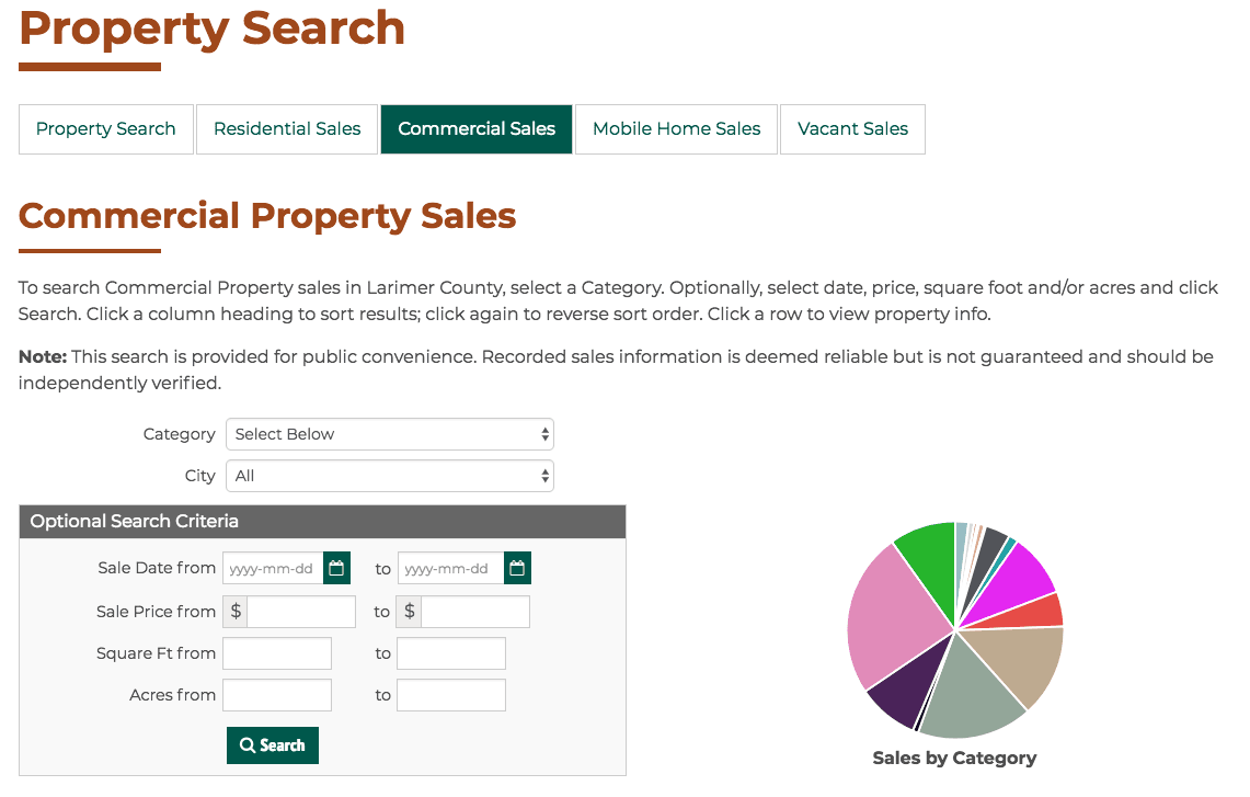 You can search either residential or commercial sales by property type, city, sale date, price, square footage and/or amount of acres. For county-based websites, Larimer County is ahead of the curve when it comes to searching for recently sold commercial properties. Their search platform offers a great deal of customizability.