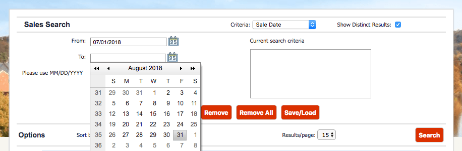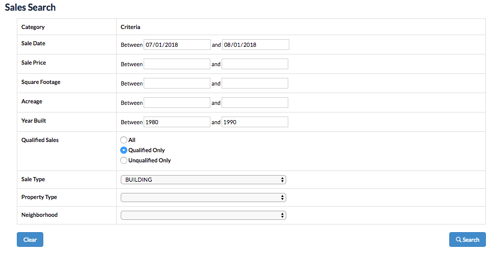 If you click that, you’ll be taken to another page where you can begin a search specifically for property sales. On the Sales Search page, you’ll be able to filter your search by sale date, sale price, square footage, acreage, year built, sale type, and property type.