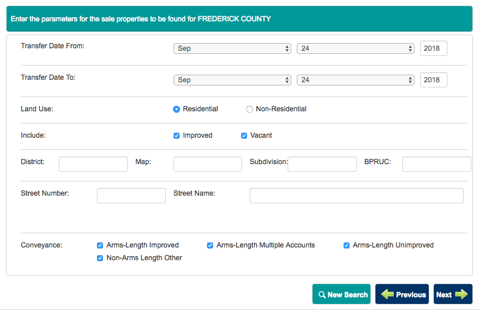 SDAT is Maryland’s State Department of Assessments & Taxation. On the site, there are property sales records for properties in all Maryland counties. By going to the “Real Property Search” page on the site, you are given the option to first select a county, and then select a “search method.” For those looking for recently sold properties in Maryland, after choosing their desired county, they can then choose “Property Sales” as the search method. From there, another page of options will appear, asking you to select dates, whether the property is residential or non-residential, as well as other address details and conveyances.